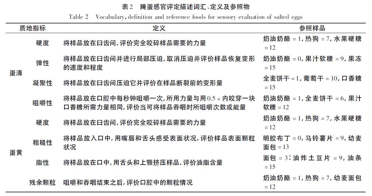 腌蛋的感官评价使用质地剖面分析法,实验使用0~15 标尺,0和15 分别表示非常小和非常大。使用的描述词汇、定义和参照物见表2。招募了6 名食品专业的学生( 4 名女性、2 名男性) 作为评审员,进行6 次重复实验。感官评价时,蛋清切成10 mm × 10 mm × 8 mm 大小,蛋黄切成20 mm × 20 mm × 10 mm 大小。评审小组的选拔和培训以及整个感官评定的过程参照GB /T 16860-1997的具体要求进行。