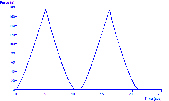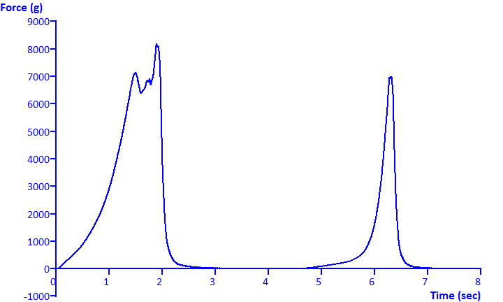 不是所有的产品都有脆性,但是在探头第1次压缩样品的过程中,当它们破裂时,在曲线有第1个峰的位置(在该处力值下降),出现脆性点。 | |||||