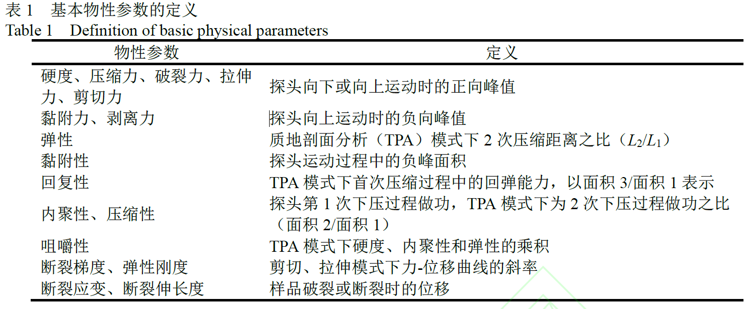 质构仪又称物性分析仪,是一种能够准确描述样品受力后力、位移、时间3 个参数变化过程的精密仪器,能以数据客观反映样品的各种物理特性参数,其结果具有较高的准确性、灵敏性与客观性。质构仪早应用于食品行业,测定的物性参数能较好反映食品质量优劣,已被广泛应用于客观评价食品品质;此外,质构仪在农业工程、化工材料、生物医学等领域也得到了成功应用,如测定小麦茎杆的弯曲性能、灯丝的力学性能以及骨的生物力学性能等。