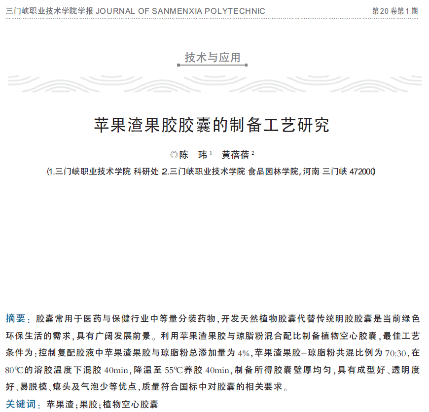 Data download2021年,三门峡职业技术学院研究人员在国内期刊《三门峡职业技术学院学报》在线发表了题为“苹果渣果胶胶囊的制备工艺研究”的研究文章。在该论文中,研究人员使用上海腾拔仪器科技有限公司的凝胶强度测定仪来测定胶液的凝胶强度。