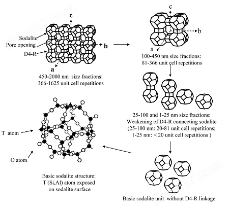 5 四种颗粒大小的沸石的透射电子显微镜图和结构转变原理图