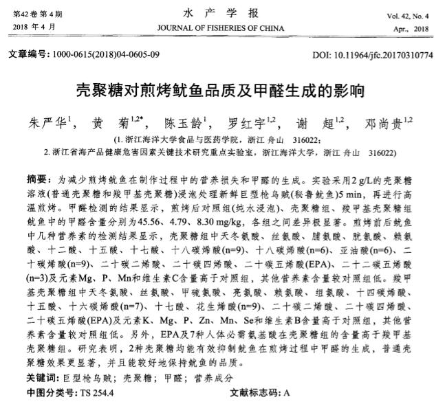 摘要 :为减少煎烤鱿鱼在制作过程中的营养损失和 甲醛的生成。实验采用2g/L的壳聚糖 溶液( 普通壳聚糖和羧甲基壳聚糖) 浸泡处理新鲜 巨型枪乌贼( 秘鲁鱿鱼) 5mi n,再进行高 温煎烤。甲醛检测的结果显示,煎烤后对照组( 纯水浸泡) 、壳聚糖组、羧甲基壳聚糖组 鱿鱼中的甲醛含量分别为45.56、4.79、8.3 0mg/kg,各组之间差异极显著。煎烤前后鱿鱼 中几种营养素的检测结果显示,壳聚糖组中天冬氨酸、丝氨酸、脯氨酸、胱氨酸、赖氨 酸、十二酸、十五酸、十七酸、十八碳烯酸( n =9 ) 、十八碳烯酸( n =6 ) 、亚油酸( n =6 ) 、二 十碳烯酸( n =9 ) 、二十碳二烯酸、二十碳 四烯酸、二十碳五烯酸( EPA) 、二十二碳五烯酸 ( n =3 ) 及元素Mg、P、Mn和维生素C含量高于对照组,其他营养素含量较对照组低。羧 甲 基壳聚糖组中天冬氨酸、丝氨酸、甲硫氨酸、亮氨酸、赖氨酸、组氨酸、十四碳烯酸、十五酸、十六碳烯酸( n =7 ) 、十七酸、花生烯酸( n=9) 、二十碳二烯酸、二十碳四烯酸、二十碳五烯 酸( EPA) 及 元素K、Mg、P、Zn、Mn、Se和 维生素B含 量高于对 照组 ,其他 营 养素含量较对照组低。另外,EPA及7种人体必需氨基酸在壳聚糖组的含量高于羧 甲基 壳聚糖组。研究表 明,2种壳聚糖均能有效抑制鱿鱼在煎烤过程中甲醛的生成,普通壳 聚糖效果更显著,并且能较好地保持鱿鱼的品质。