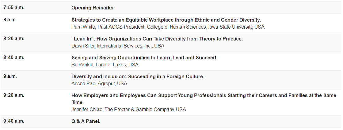 Each speaker will address an aspect of diversity and inclusion, whether it’s breaking barriers in a new role, promoting change from the top-down or bottom-up, and/or finding work/life balance in two-income households, particularly as young professionals struggle to launch both their careers and their families. This session recognizes the changes in AOCS membership/leadership composition since its inception in 1909 and the unique challenges facing this more diverse group; AOCS member companies are facing the same changes.