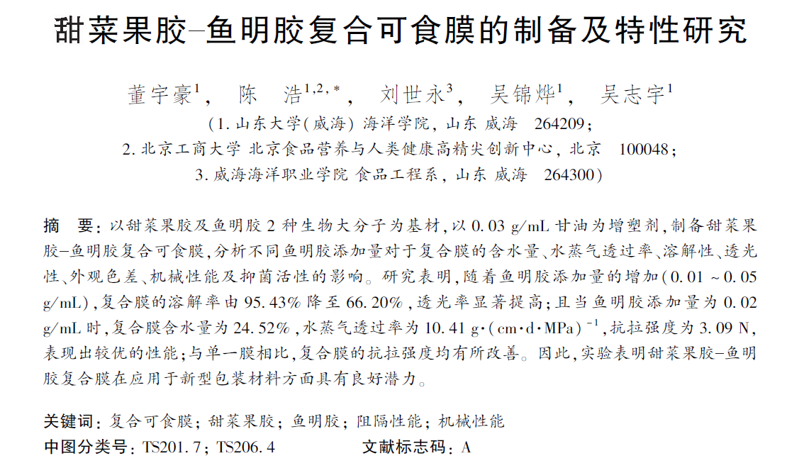 2019年,山东大学、北京工商大学、威海海洋职业学院联合在国内期刊《食品科学技术学报》在线发表了题为“甜菜果胶鱼明胶复合可食膜的制备及特性研究”的研究文章。在该文章中,研究人员使用Universal TA研究型质构仪测定复合膜的抗拉强度。