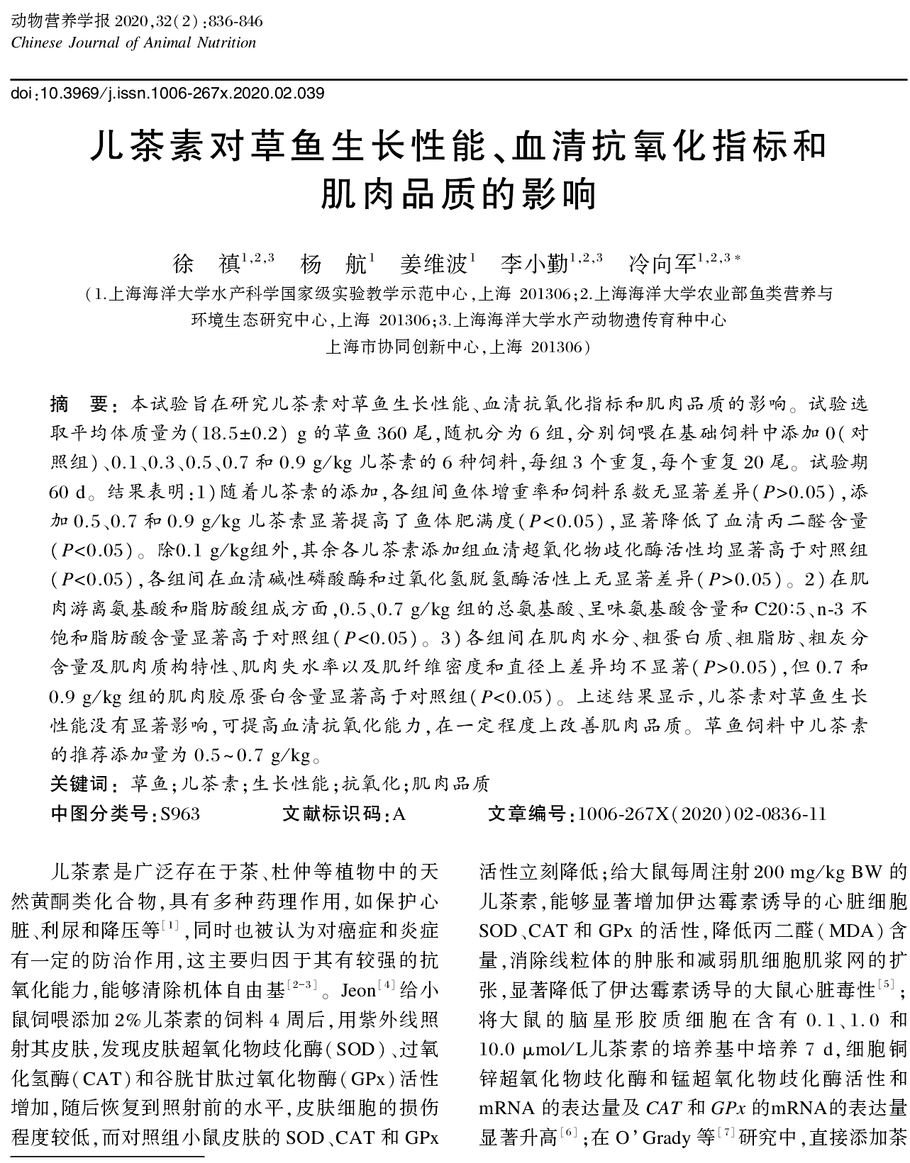 摘 要: 本试验旨在研究儿茶素对草鱼生长性能、血清抗氧化指标和肌肉品质的影响。 试验选取平均体质量为(18.5±0.2)g的草鱼360尾,随机分为6组,分别饲喂在基础饲料中添加0(对照组)、0.1、0.3、0.5、0.7和0.9g/kg儿茶素的6种饲料,每组3个重复,每个重复20尾。 试验期60d。 结果表明:1)随着儿茶素的添加,各组间鱼体增重率和饲料系数无显著差异(P>0.05),添加0.5、0.7和0.9g/kg儿茶素显著提高了鱼体肥满度(P<0.5),显著降低了血清丙二醛含量(P<0.05)。 除0.1g/kg组外,其余各儿茶素添加组血清超氧化物歧化酶活性均显著高于对照组(P<0.05),各组间在血清碱性磷酸酶和过氧化氢脱氢酶活性上无显著差异(P>0.05)。 2)在肌肉游离氨基酸和脂肪酸组成方面,0.5、0.7g/kg组的总氨基酸、呈味氨基酸含量和C20:5、n-3不饱和脂肪酸含量显著高于对照组( P<0.05)。 3)各组间在肌肉水分、粗蛋白质、粗脂肪、粗灰分含量及肌肉质构特性、肌肉失水率以及肌纤维密度和直径上差异均不显著(P>0.05),但0.7和0.9g/kg组的肌肉胶原蛋白含量显著高于对照组(P<0.05)。 上述结果显示,儿茶素对草鱼生长性能没有显著影响,可提高血清抗氧化能力,在一定程度上改善肌肉品质。 草鱼饲料中儿茶素的推荐添加量为0.5-0.7g/kg。