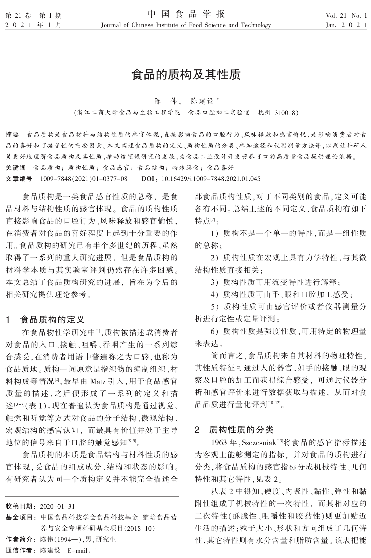 2021年1月,国内食品领域期刊《中国食品学报》刊登了浙江工商大学食品与生物工程学院陈伟、陈建设*题为“食品的质构及其性质”的论文。