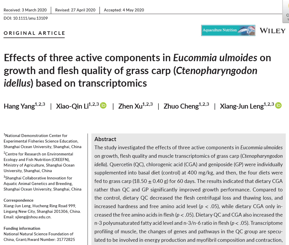 Data download2020年5月,农林科学领域期刊《Aquaculture Nutrition》在线发表了上海海洋大学研究人员题为“Effects of three active components in Eucommia ulmoides on growth and flesh quality of grass carp (Ctenopharyngodon idellus) based on transcriptomics”的研究论文。
